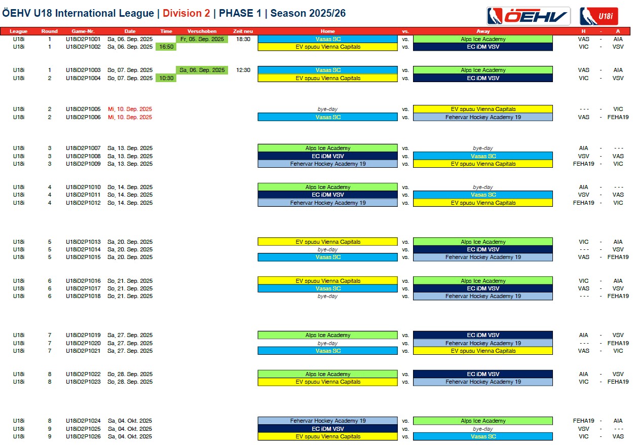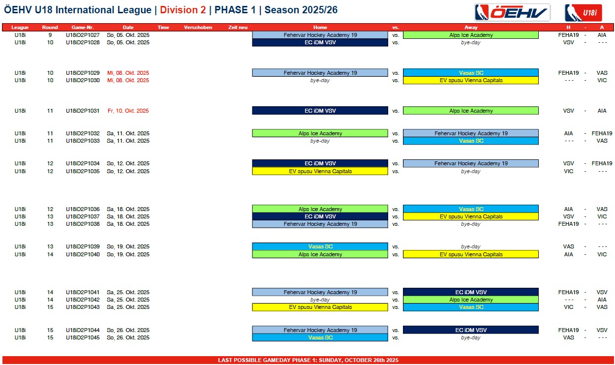 Die U18 International League startet von September 2025 bis November mit Phase 1. Dabei wird eine eineinhalbfache Hin- bzw. Rückrunde gespielt. Nach absolvierter Phase 1, spielen im Play Up/Down der 5. aus Division 1 gegen den 2. aus Division 2 und der 6. aus Division 1 gegen den 1. der Division 2 zwei Spiele im „CHL-Modus“. Die Sieger absolvieren Phase 2 in Division 1, die Verlierer in Division 2.
